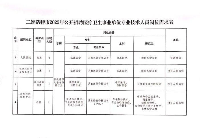 8.具备应聘岗位所要求的其他资格条件(详见《二连浩特市2022年公开招聘医疗卫生事业单位专业技术人员岗位表》)。